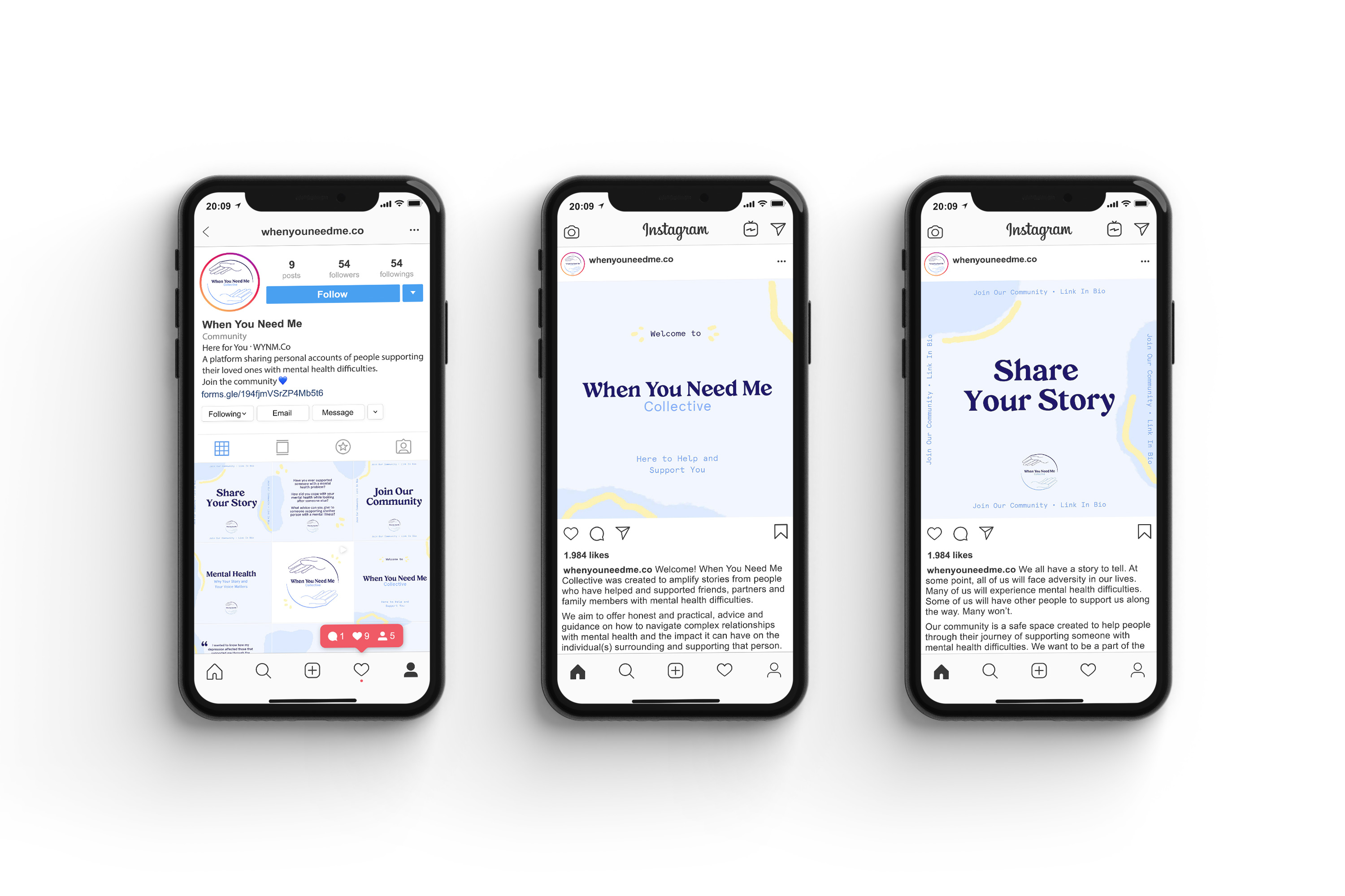 We launched When You Need Me, Co. through Instagram posts and stories, with the aim of amplifying stories from people who have helped and supported friends, partners, and family members with mental health difficulties.