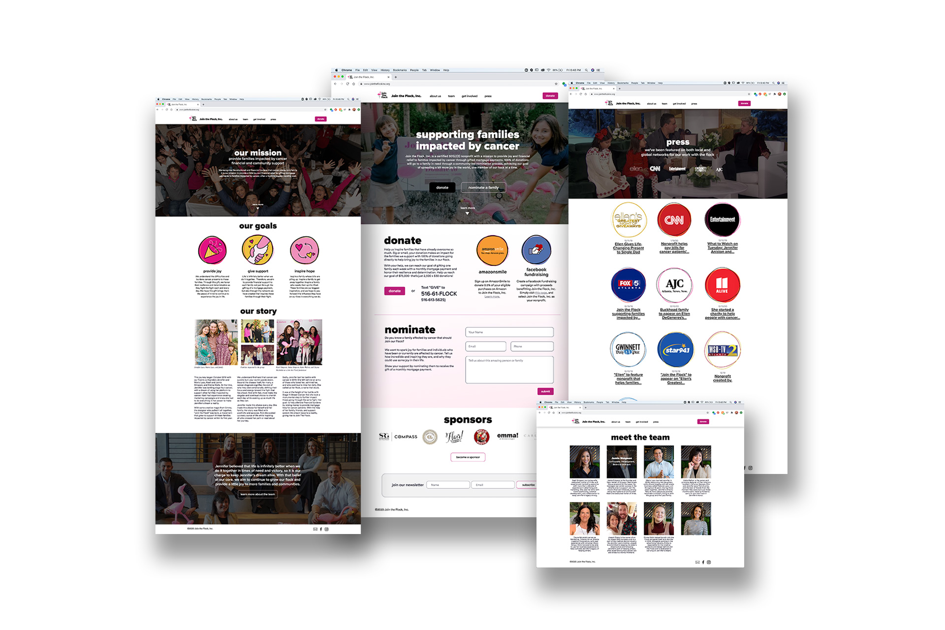 Join the Flock was created to pay the mortgages of those affected by cancer, often a family's largest monthly cost. Simpson Real Estate Group and Casa de Lazo were inspired to create this 501(c)(3) nonprofit (oh yes, it's official) from the organization's co-founder Jennifer Lazo, who bravely battled Stage IV Breast Cancer before passing away after the nonprofit's first year. I partnered with these two Atlanta businesses to develop Join the Flock's logo, brand identity, website, and merch to raise awareness and guide the group in creative projects. We used the motif of a flock of flamingos throughout the branding, a recognized cancer motif and symbol of community.
